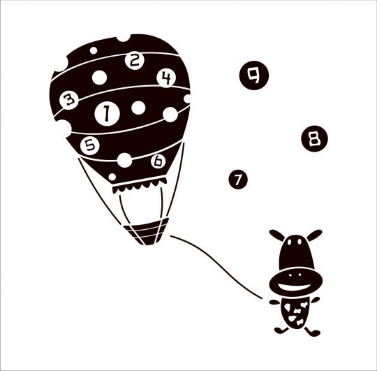 Vinilo de un globo aerostático y una vaca, en negro, para decorar paredes y muebles de 140*140cm.Muy fácil de colocar es AUTOADHESIVO.